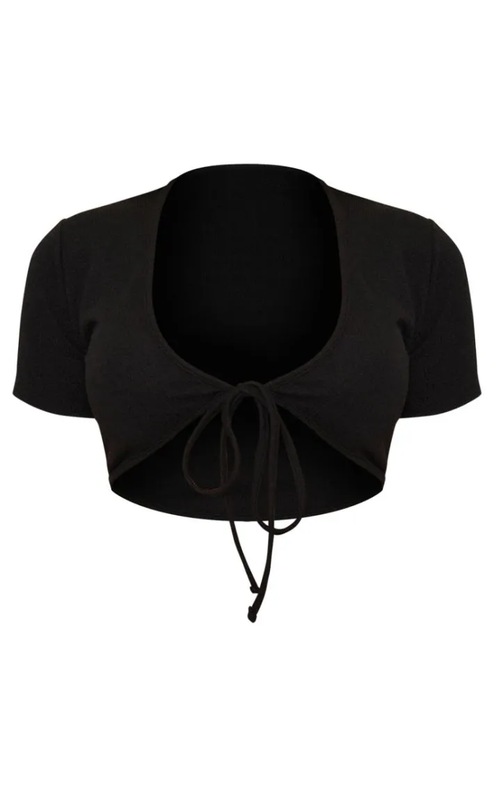 Make room in your new season wardrobe for this unreal black textured jersey tie front short sleeve crop top, we’re in love. It is made using a black textured jersey material with a tie front design and short sleeves, you’re sure to be adding this crop top straight to your basket. Just add the matching skirt, sandals and statement accessories for a look that is perfect for those warm weather days.