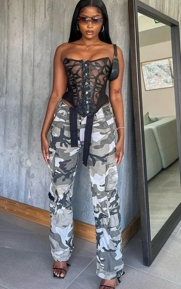 This textured mesh corset is sure to give your look a fierce update. Featuring a black textured mesh lace material with hook fastenings on the front and a ribbon lace-up back, team it with a drape midi skirt and heels for a fierce weekend combo.
