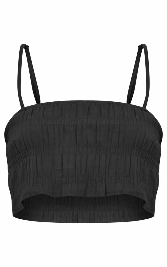 Take your new season wardrobe that extra mile with this black textured ruched cotton strappy crop top, we’re in love. This top features a black textured cotton material with ruched detailing and thin straps, you’ll be adding it straight to your basket. Team with the matching shorts, western boots and your fave accessories for a look we just can’t get enough of.