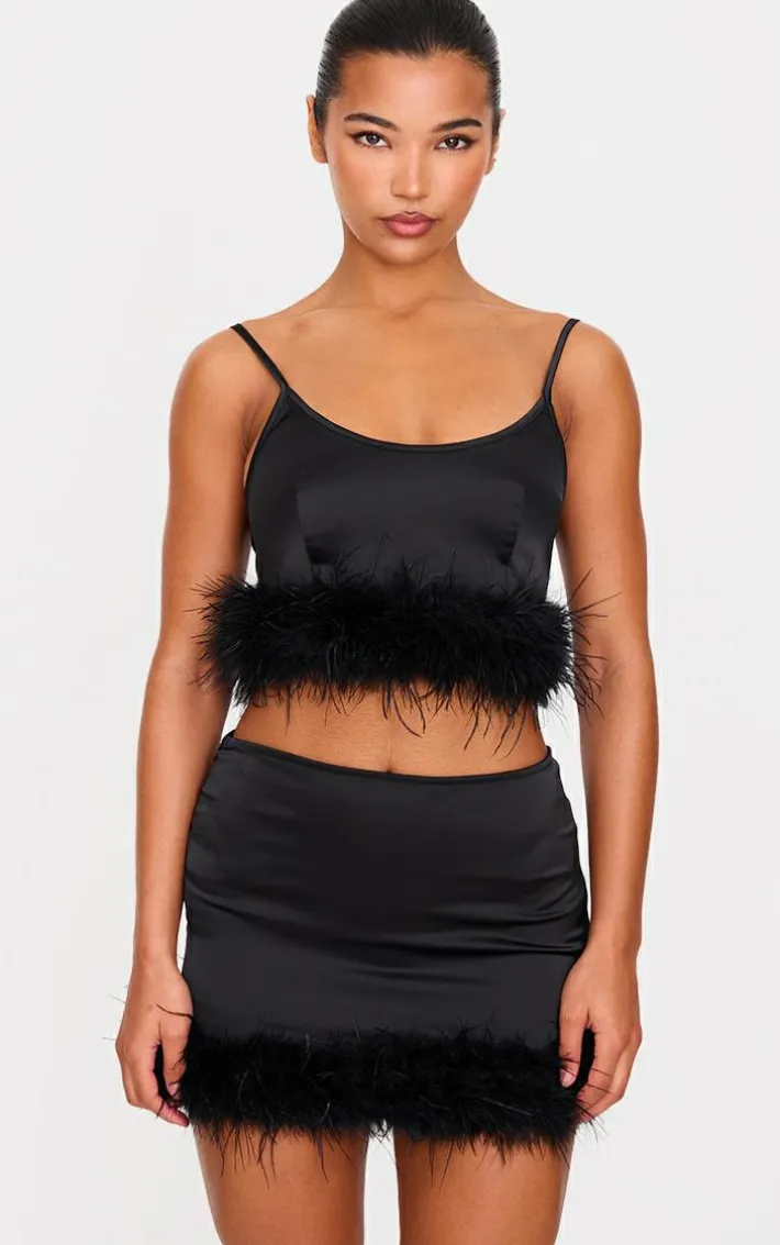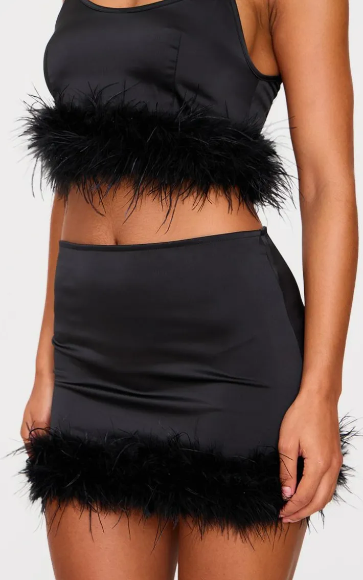 Bring all the chic satin feels to your weekend wardrobe with this black textured satin feather trim mini skirt. Made from a black textured satin material with feather trim detailing and a mini length, how can you resist? Style this mini skirt with the matching top, heels and simple accessories for a look they won’t be able to take their eyes off.