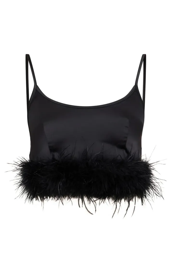 Look all kinds of chic in this black textured satin feather trim strappy top. Brought to you in a black textured satin material with feather trim detailing and thin straps, how can you resist? Style this strappy top with the matching skirt, heels and gold accessories for a look that will really make a statement this weekend.