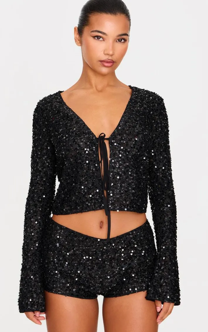 Meet your new essential for events season with this black textured sequin tie top, perfect for your weekend plans. Brought to you in a black hue textured material with a sequin design and tie front fastening, this top is a must have. How can you resist? For a look that will get you noticed, style with the matching hot pants, strappy heels and gold accessories.