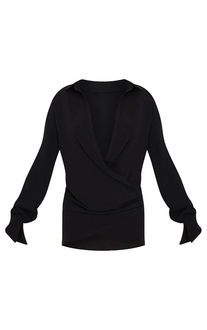 This long sleeve shirt dress is sure to give your weekend wardrobe a serious update. Featuring a black textured woven material with an extreme plunging neckline, bell cuff sleeves and a shirt silhouette. A wrap shirt dress gives your silhouette the best of both worlds. This style is super versatile and perfect for dressing up or down whatever the occasion. Team this with heeled mules and simple accessories to complete the look.