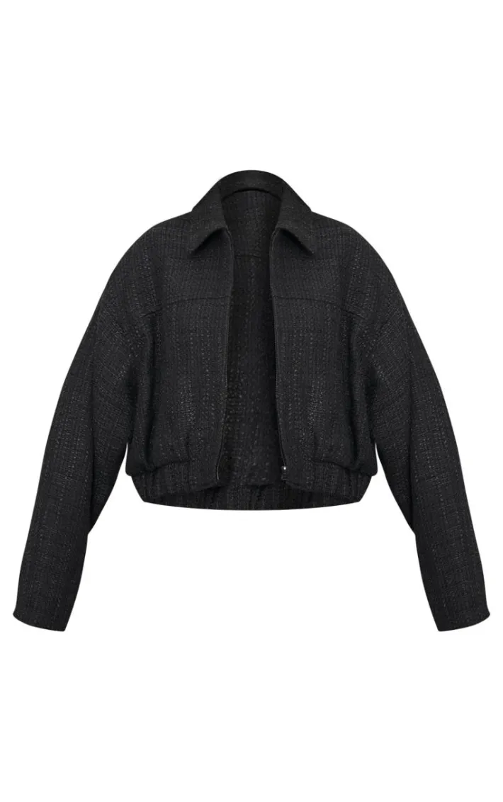 Stay cosy this season in this black textured zip up bomber jacket. Brought to you in a black hue textured material with a zip up design, this bomber jacket is at the top of our most wanted list. How can you say no? Team with a white tee, puffball skirt, chunky boots and a statement fluffy hat for a cold weather fit we can’t keep up with.