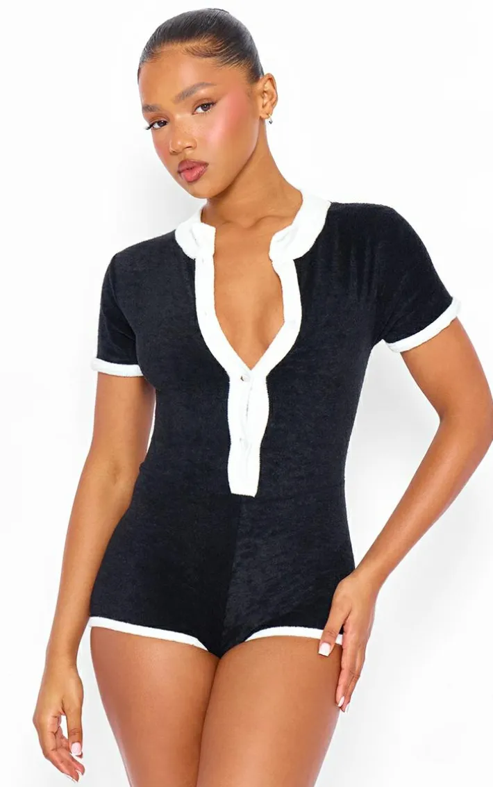 Make everyday styling look effortless with this black towelling contrast detail unitard. Brought to you in a black hue towelling material with a contrasting design and a figure-flattering fit, what more could you want? Style this black unitard with sandals and simple gold accessories for a look you will be reaching for again and again.