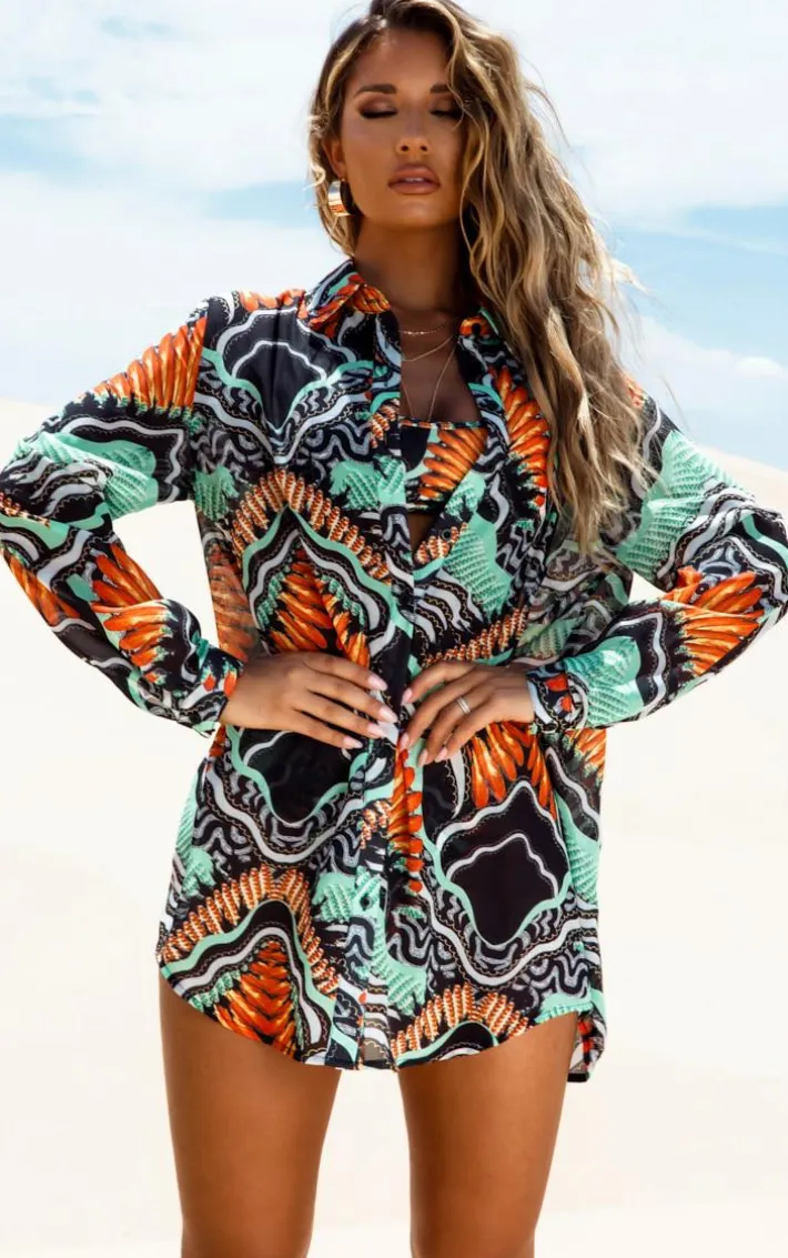 Look next level with this beach shirt, featuring a black tribal printed chiffon fabric. We love this teamed with the matching bikini and pants for a look that’s sure to have you killing it.