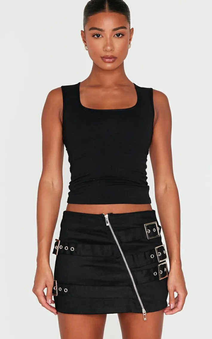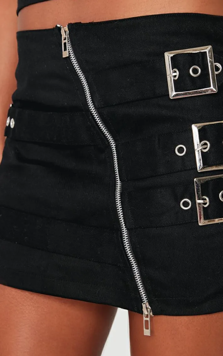 We’re loving this black twill multi belt detail mini skirt for a weekend look. Brought to you in a must have black hue, with an edgy multi belt design and twill material, what’s not to love? Simply pair with a black vest top and minimal accessories for a look that won’t go unnoticed.