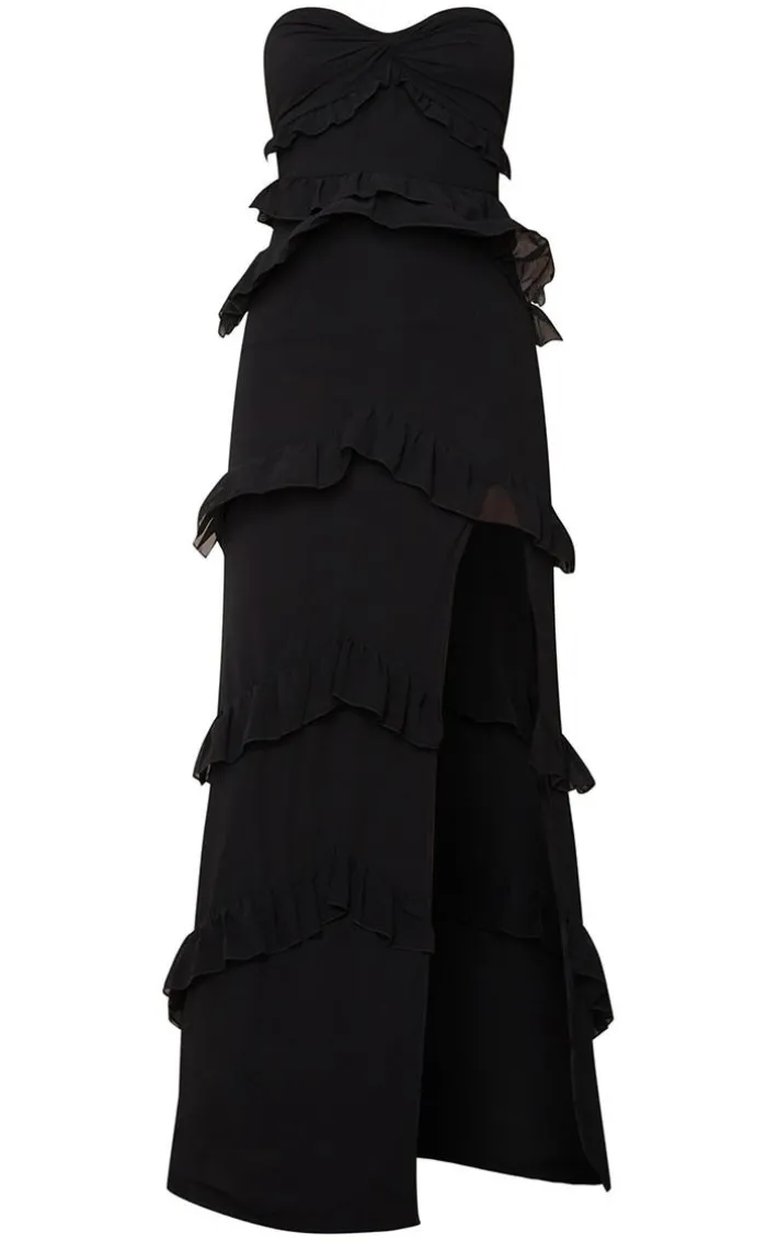 Take your weekend look to new heights with this black maxi dress. Featuring a black material with a twist bandeau neckline and tiered detail, what’s not to love? Keep it simple and style this long black dress with strappy sandals and matching accessories for a look that will steal the spotlight.
