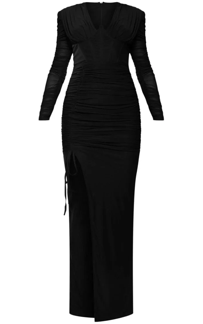 This dress is sure to be at the top of your new season wish list. Featuring a black mesh material with ruched detailing and an underwire design, we’re obsessed. Style with clear heels and simple accessories for the perfect occasion-ready fit.