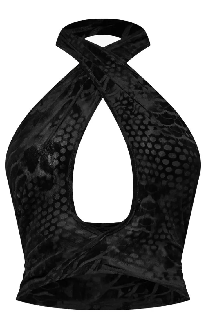 Be the moment in this black velvet devore plunge backless top. Your evenings have never looked better with its chic black velvet devore fabric, plunge cross neckline and backless design. Date night is officially sorted. Just add a black mini skirt, heels and your favorite jewelry for a look you won’t be able to resist.