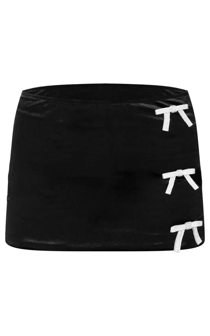 Bring all the chic velvet feels to your weekend wardrobe with this black velvet diamante bow trim mini skirt. Made from a black velvet material with diamante bow trim detailing for that luxe finishing touch, how can you go wrong? Style this mini skirt with a top, court heels and sheer tights for a weekend-worthy look to be remembered.