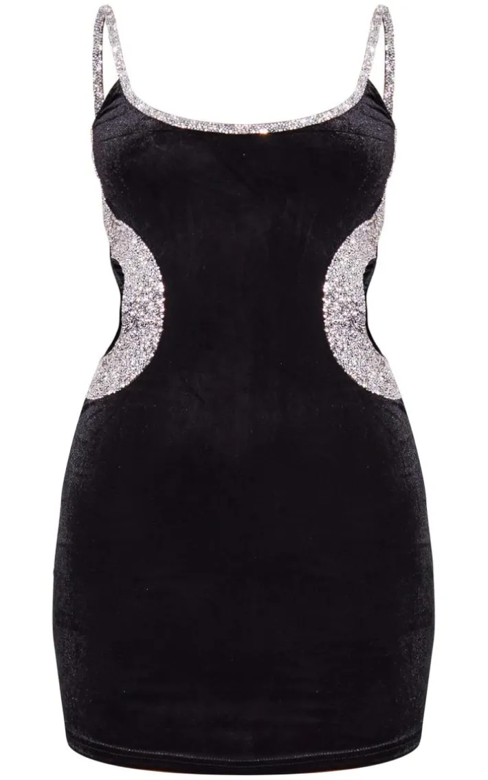 Give your wardrobe a seriously chic update with this dress. Featuring a black velvet material with diamante trim and a bodycon length. Team with your go-to heels and silver accessories for a look that will make heads turn.