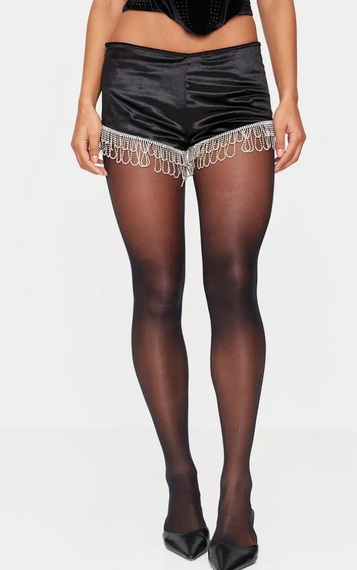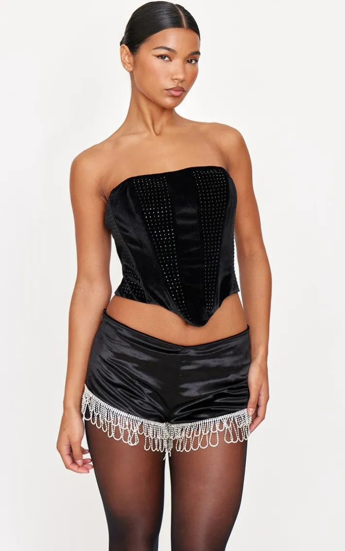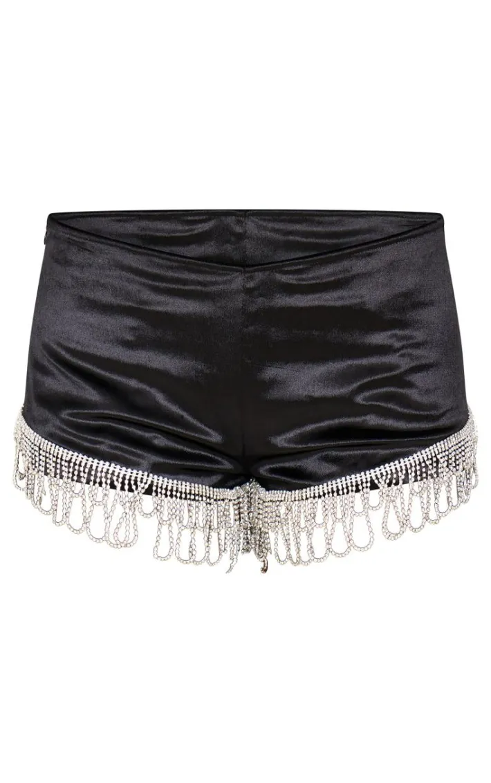 Make a statement whatever your weekend plans with these black velvet diamante trim hot pants. Brought to you in a chic black shade, with a luxe velvet material and diamante trim, take a chance for a look you won’t regret. Pair with a black velvet top and tights for a look we’re loving this season. It’s a yes from us.