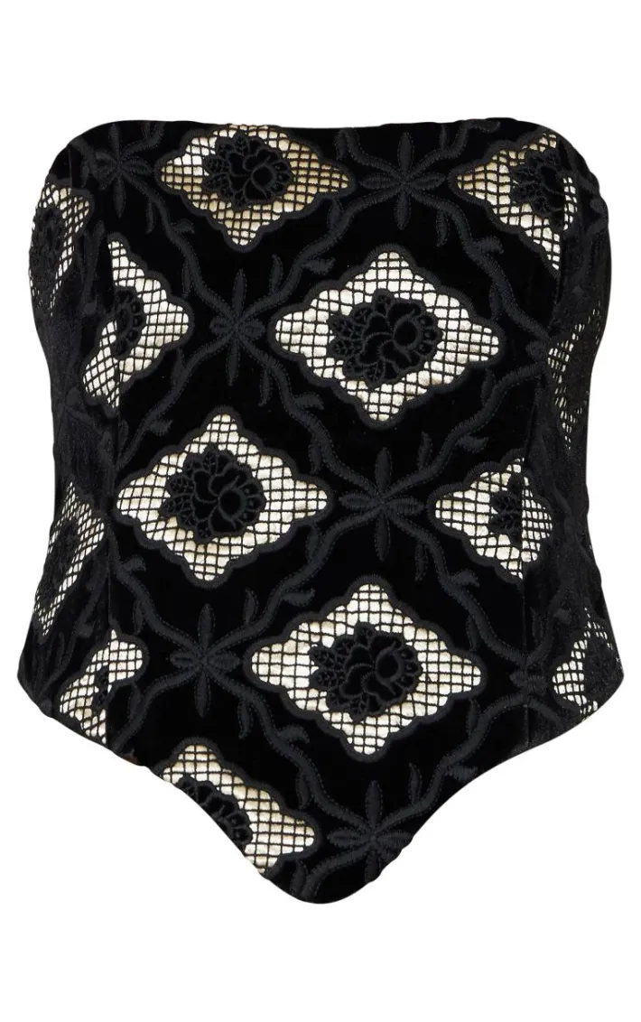 Elevate your weekend look with this black velvet floral jacquard corset. Brought to you in a black velvet jacquard material with a floral print design and a figure-flattering corset fit, how can you say no? Style this velvet corset with a gold velvet mini skirt, slip on heels and silver accessories for a look they won’t be able to take their eyes off.