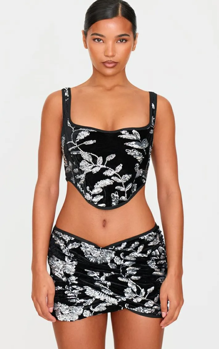 You’ll be the best dressed in any room with this black velvet floral sequin embellished ruched micro mini skirt. Its features include a chic black velvet fabric, floral sequin embellishment and ruched, figure-hugging design. This micro mini skirt will instantly elevate your look when paired with the matching top and court heels. How can you say no?