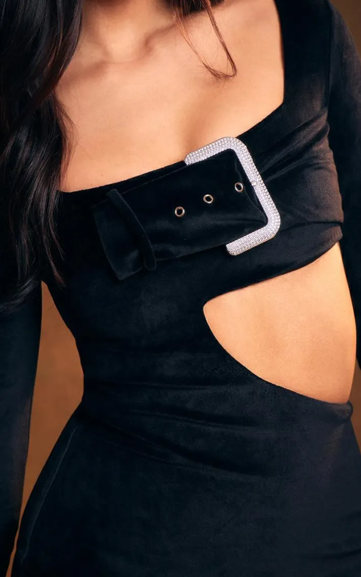 Get ready to have all eyes on you with this black velvet long sleeve diamante buckle mini dress. Brought to you in a black velvet material with a long sleeve design and a diamante buckle, what’snot to love? With it’s mini length, you’ll be sure to earn all the likes with this dreamy piece. Finish off the look by pairing this with your fave heels and a statement shoulder bag. It’s a yes from us.