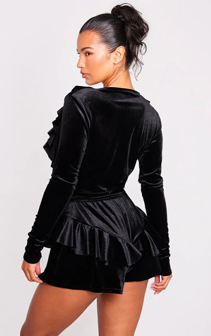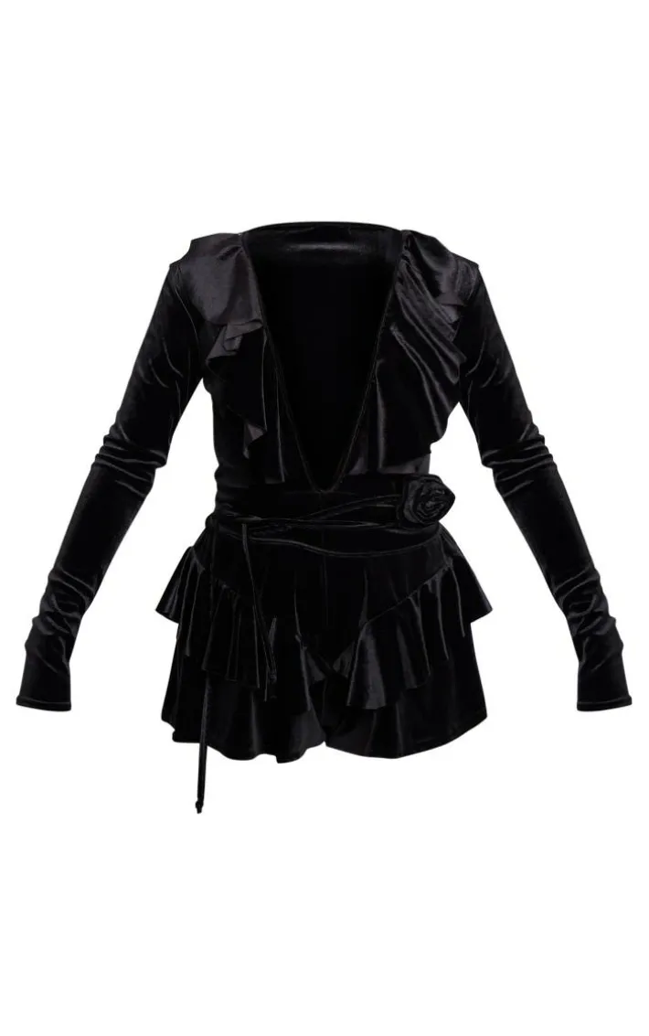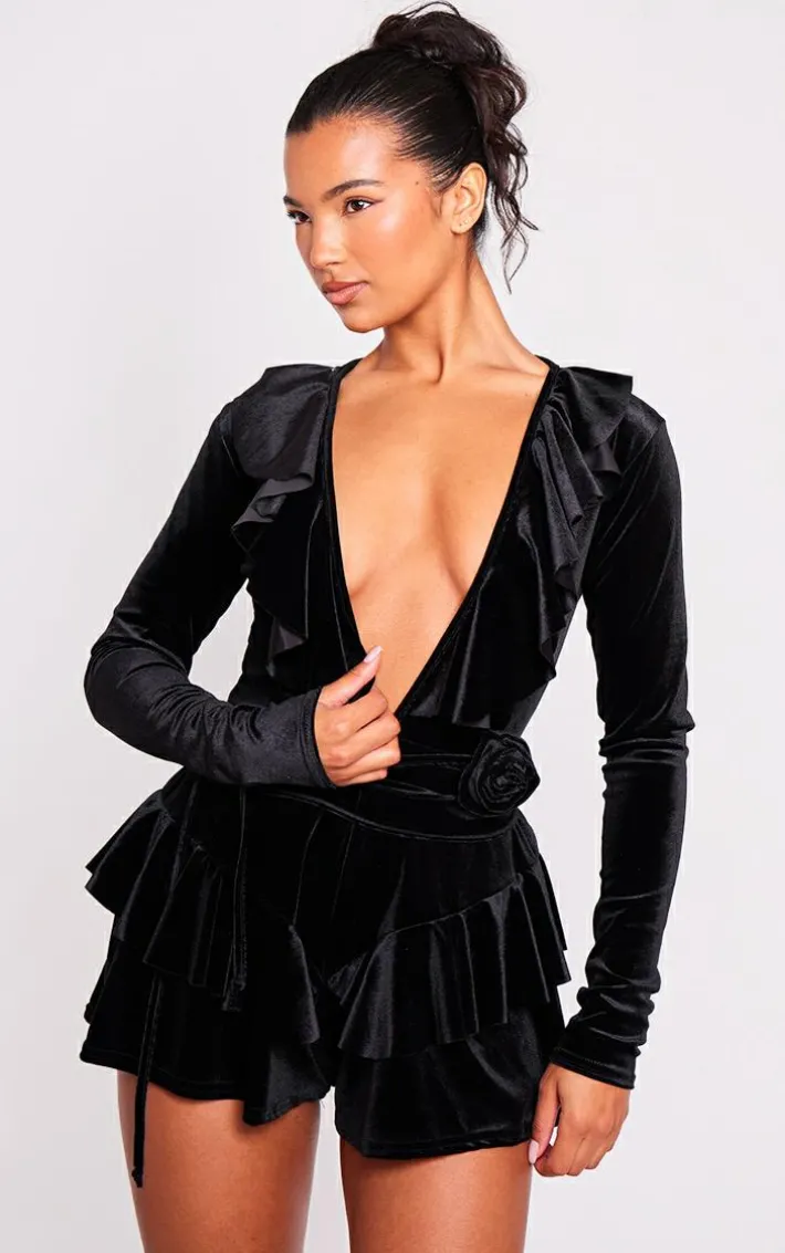Turn heads for all the right reasons this weekend with this black velvet plunge frill corsage romper. Whether you’re meeting upor have a date night in the diary, this romper is everything you’re looking for and more. With a black velvet hue material, a plunging neckline, and a corsage detail, how could you say no? Team with heeled mules and gold accessories for a look that everyone will want.