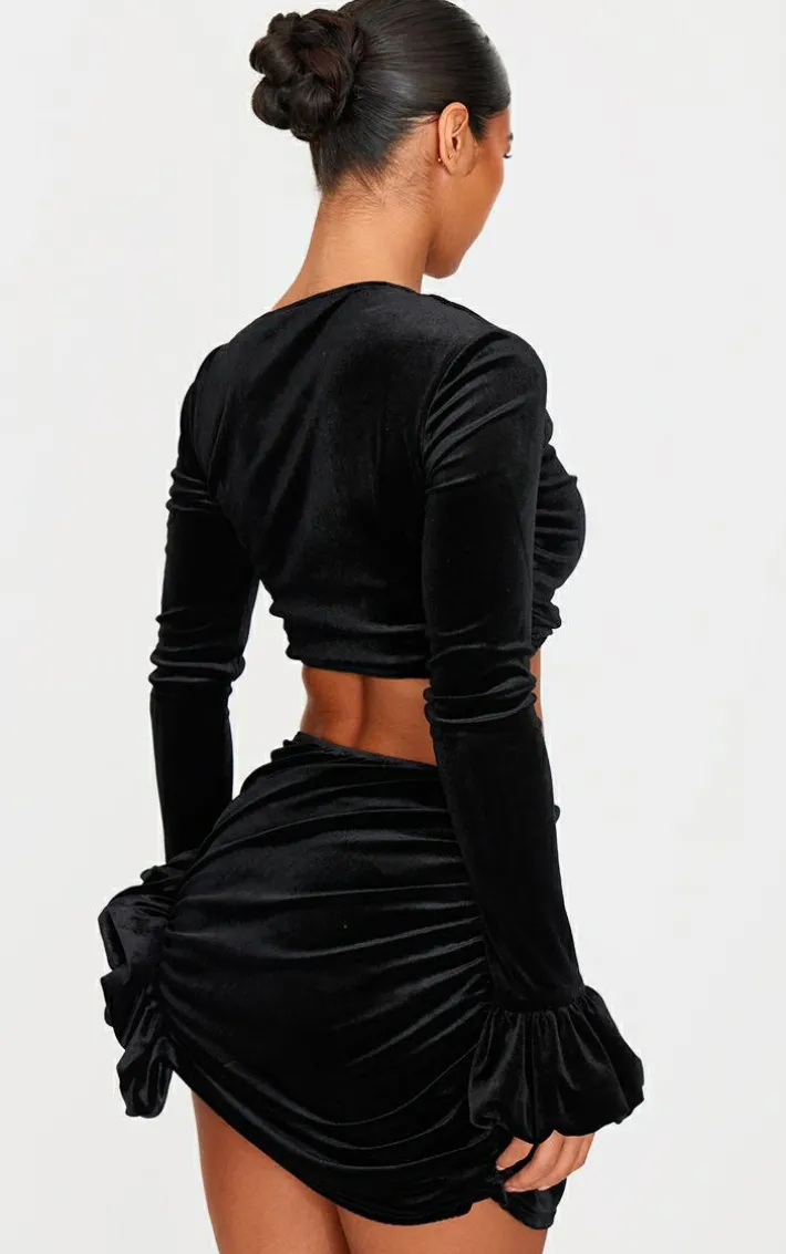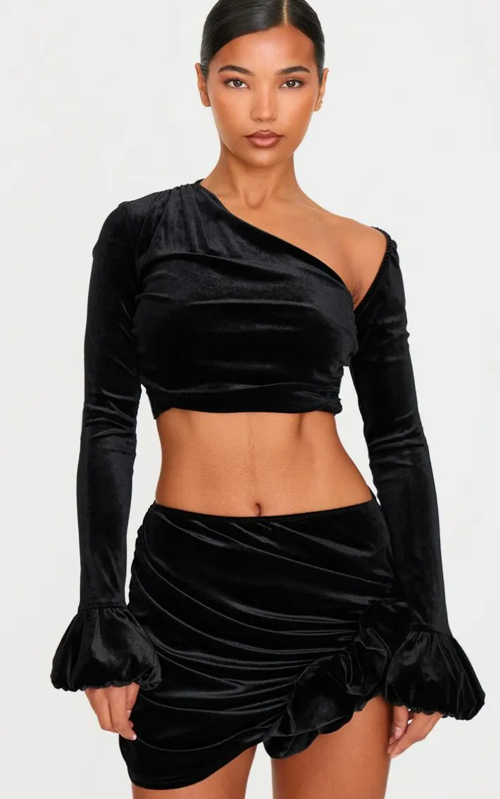 You’re going to look so chic in this black velvet puff sleeve cropped top. Whatever your evening plans, its black velvet fabric, with puff sleeves and a cropped top fit are sure to stand out from the crowd. Put together a must-have combo by pairing with the matching mini skirt and heels.