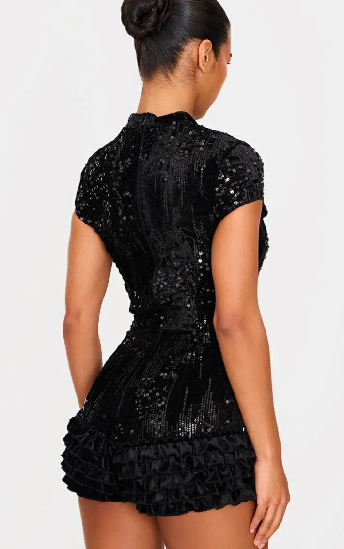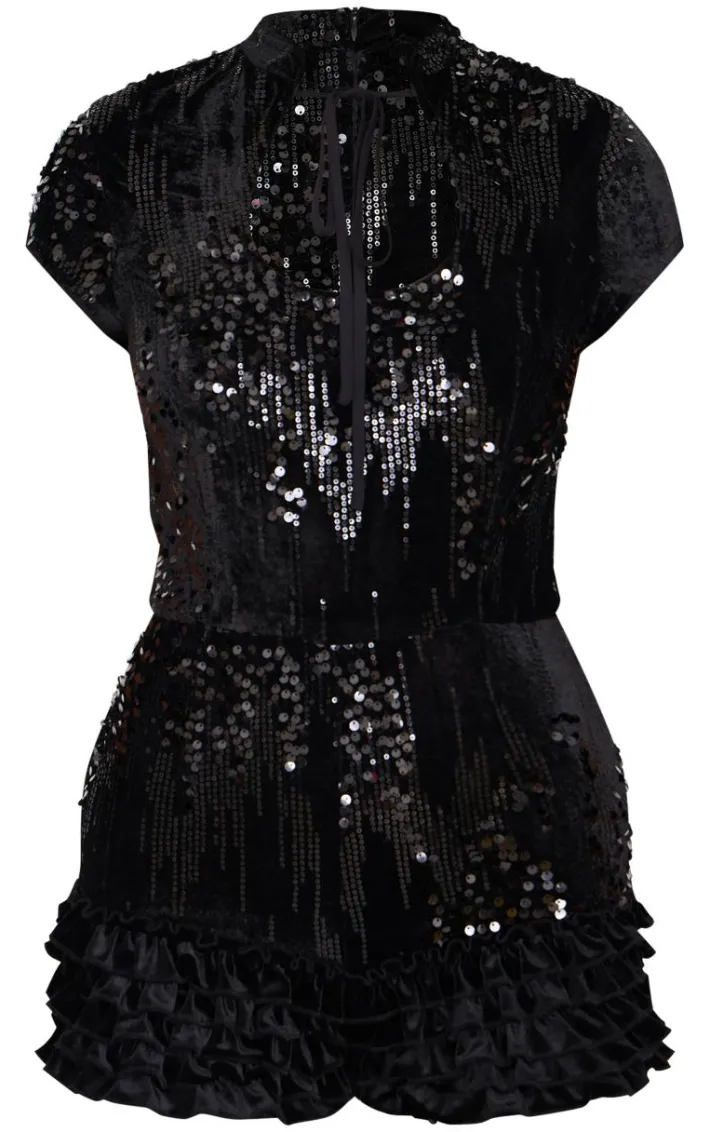 Make a statement for your next occasion in this black velvet sequin key hole bloomer romper. Brought to you in a luxe velvet material, with sequin detailing, a flattering key hole design and bloomer style, we know you’ll be looking and feeling your most confident self. This romper pairs perfectly with a pair of black heels and minimal accessories. It’s a yes from us.