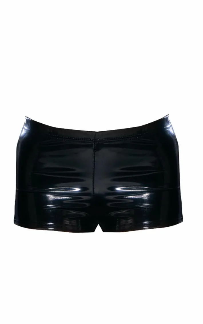 Make a serious style statement in these black vinyl hot pants. Brought to you in a shiny black vinyl material with a figure-flattering fit, what more could you ask for? Style these hot pants with the matching vinyl top, heels and accessories to instantly elevate your look. It’s a yes from us.