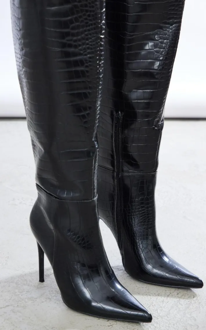 These boots are sure to be a staple piece in your new season wardrobe. Featuring a black PU croc print material with a pointed toe design and a stiletto heel, what’s not to love?