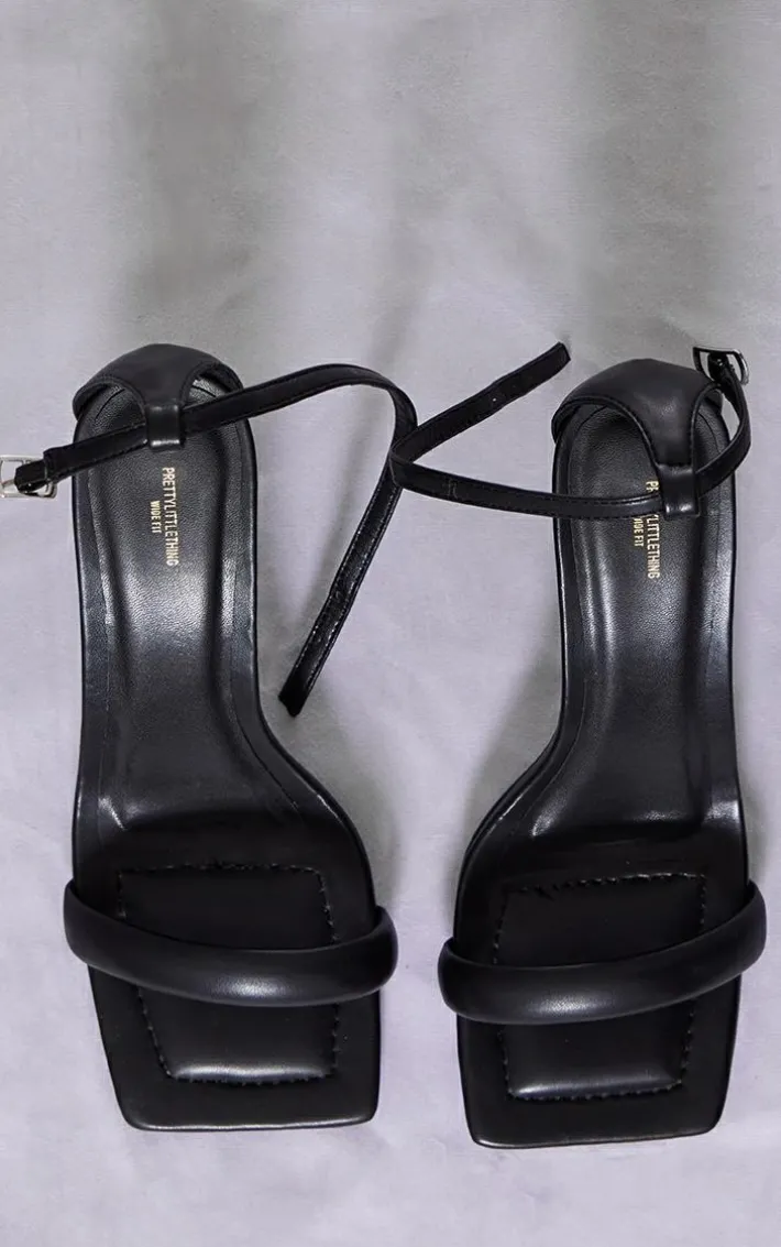 Make these black wide fit PU square toe ankle strap high heeled sandals your new weekend staple. Made from a black hue PU material with a square toe design, a wide fit and ankle strap detailing, what more could you ask for? Style these high heeled sandals seamlessly with your weekend outfit to instantly elevate any look.