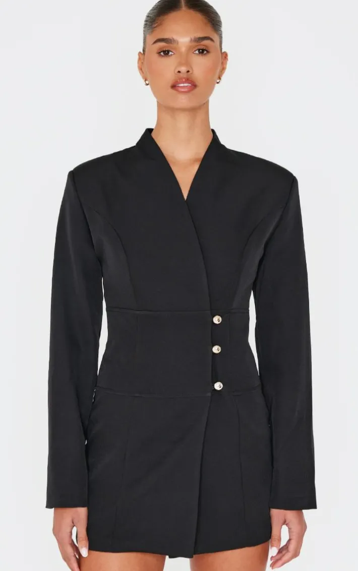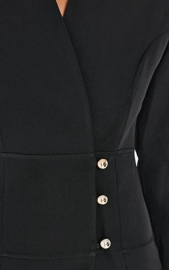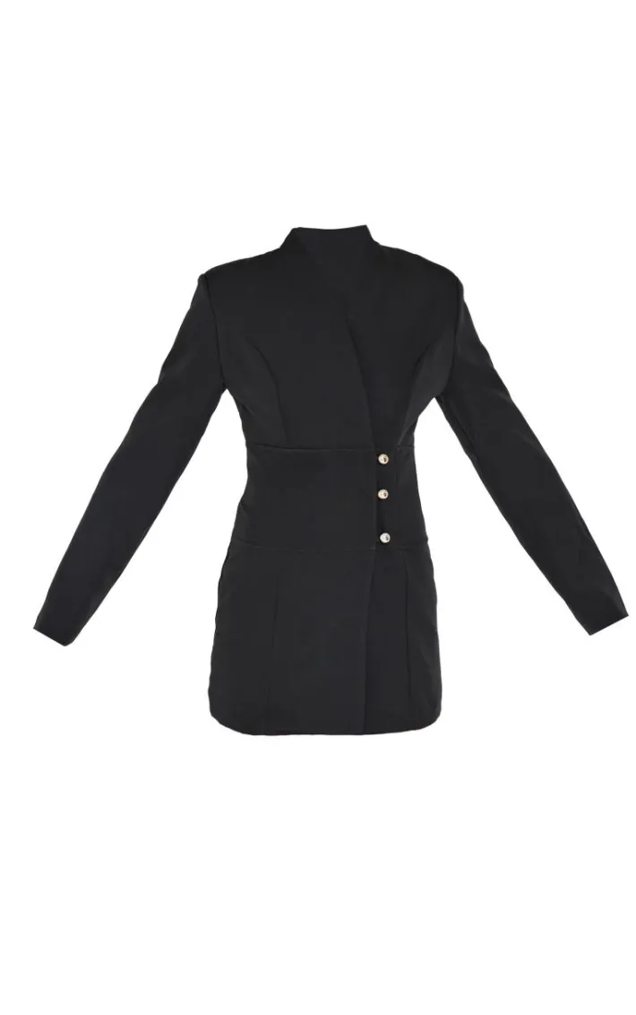 Introducing classy silhouettes with this black woven button detail blazer dress. Brought to you in a black hue woven material with a button detail, this blazer dress is all the new you need. Style with slip on heels and chic accessories for an elevated look.