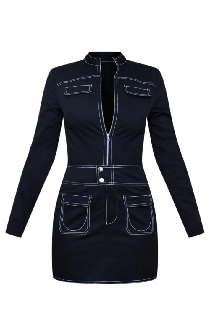 Upgrade your off-duty look with this black woven contrast stitch detail bodycon dress. Its black woven material gives your look a touch of luxe and its contrast stitch detail is sure to add a little edge to your wardrobe. This bodycon dress is super flattering and with a zip fastening you can show off your unreal figure. Shop the look and pair this bodycon dress with crew socks, loafers, and a mini bag for a statement look.
