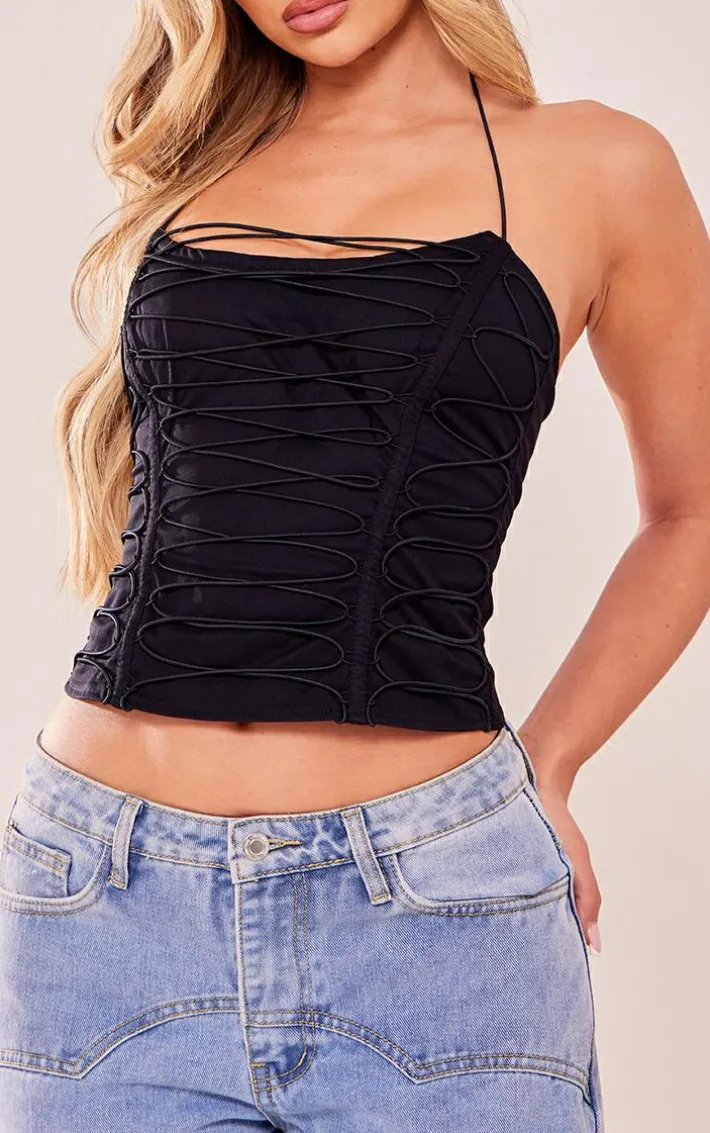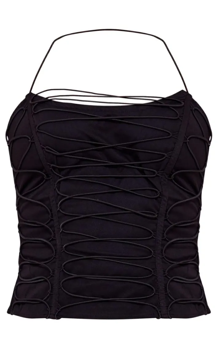 Take your weekend look to new heights with this black woven elastic lace up corset. Made from a black hue woven material that is perfect for styling with any look and featuring an elastic lace up design and a figure-flattering corset fit, what more could you want? Style this corset with wide leg jeans, your highest heels and statement accessories for a simple yet chic weekend-worthy look.