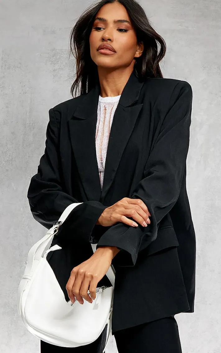 Add this statement blazer to your wardrobe. Featuring a black woven material with an oversized fit and shoulder pad design, what’s not to love? For the perfect look just pair with bottoms and lace up kicks.