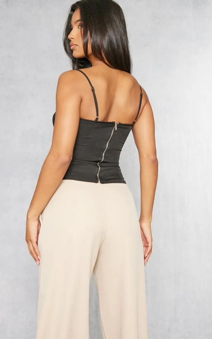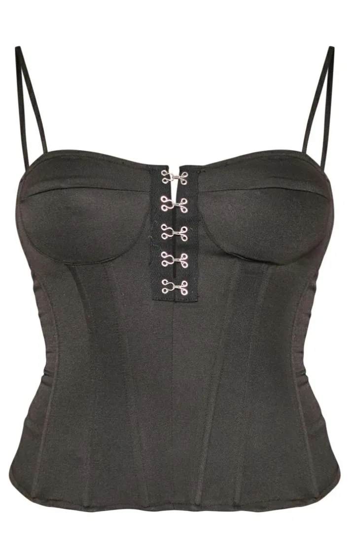 Give your look a seriously chic update with this corset. Featuring a black material with hook and eye detailing and thin straps. Style this with split hem jeans and strappy heels for drinks.