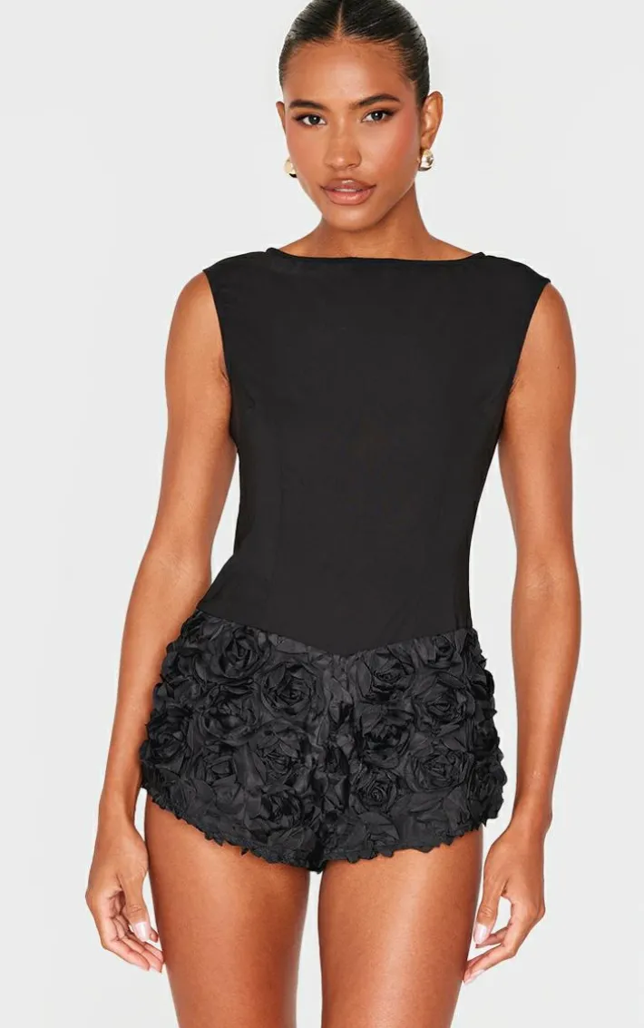 Look all kinds of chic in this black woven rose applique boat neck romper. Brought to you in a black hue woven material with a rose applique design and boat neckline, this romper is all the new you need. Team with tie up heels and gold accessories for a look like no other. How can you resist?