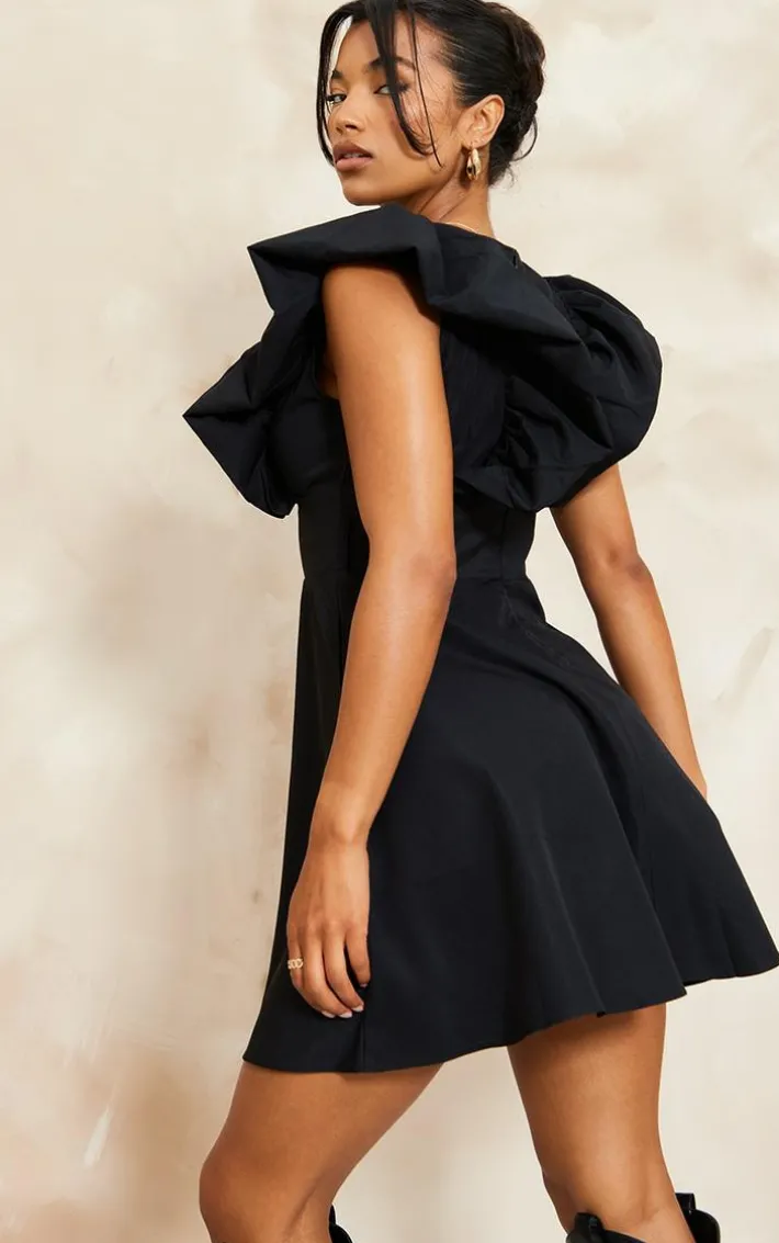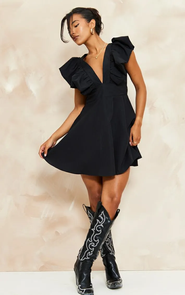 Say hello to your new season staple with this black woven ruffle sleeve plunge pleated belt shift dress. This shift dress is brought to you in a black woven material with ruffle sleeves, a plunge neckline and a belted design, what’s not to love? This shift dress is everything and more we’re loving paired with knee-high boots and gold accessories. It’s a yes from us.