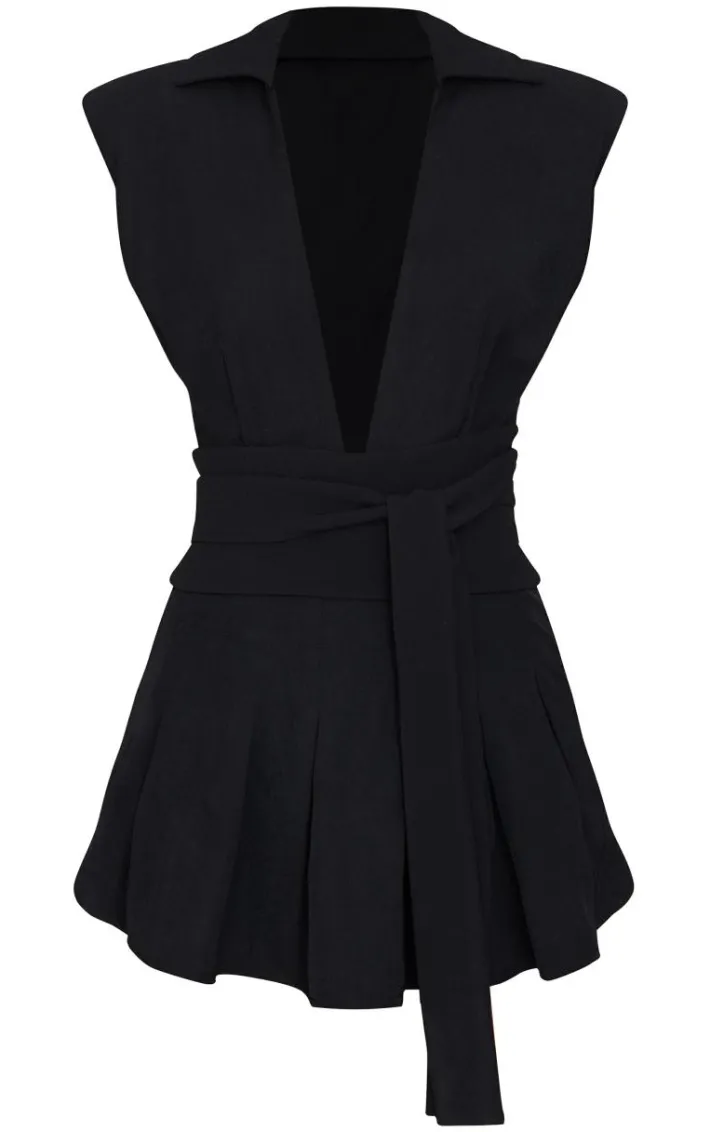 For your next evening out, look no further than this black woven shoulder pad sleeveless skort romper. You’re going to have heads turning for all the right reasons with its deep v neckline, shoulder pads and skort romper design. Match its black hue fabric with black heels and statement silver jewelry to earn all the compliments.
