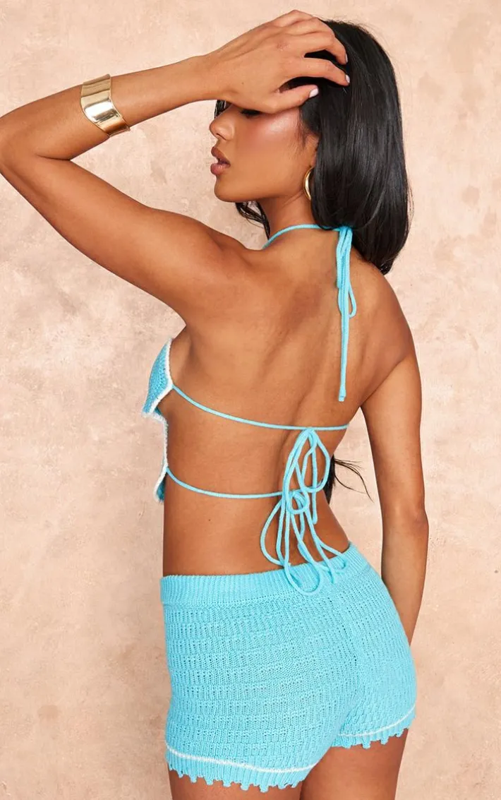 Step into this season in style in this blue crochet knit tie back flower bralet. Brought to you in a blue crochet knit material with a tie back fastening and flower design, how can you say no? Style this bralet with the matching crochet shorts, white heels and gold accessories for a statement look.