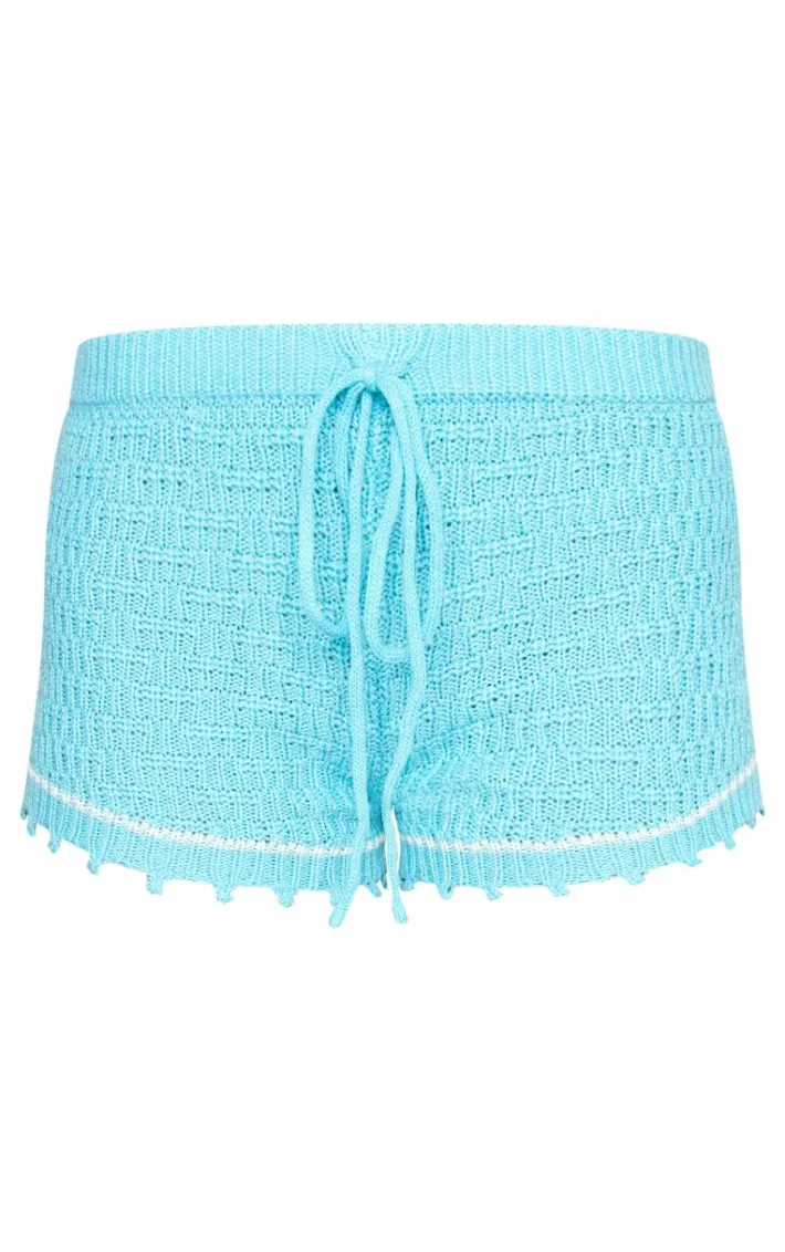 Make a statement this season in these blue crochet knit tie front mini shorts. Brought to you in a blue crochet knit material with a tie front design and mini length, what’s not to like? Style with the matching crop top, white heels and gold jewelry for an unreal combo.