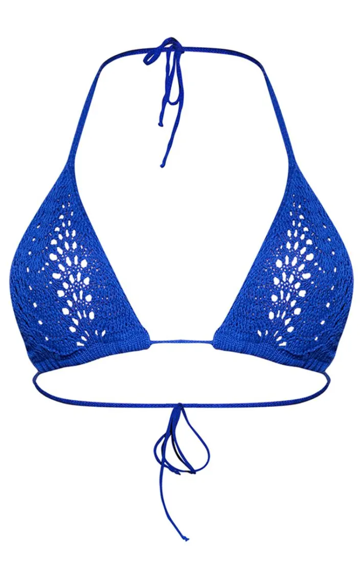 Keep your look bold and bright on your next vacay with this blue crochet triangle beach top, we’re obsessed. This top features a blue crochet material with a triangle cup design and a flattering fit. Just add the matching bottoms, skirt and statement accessories to have all the attention on you.