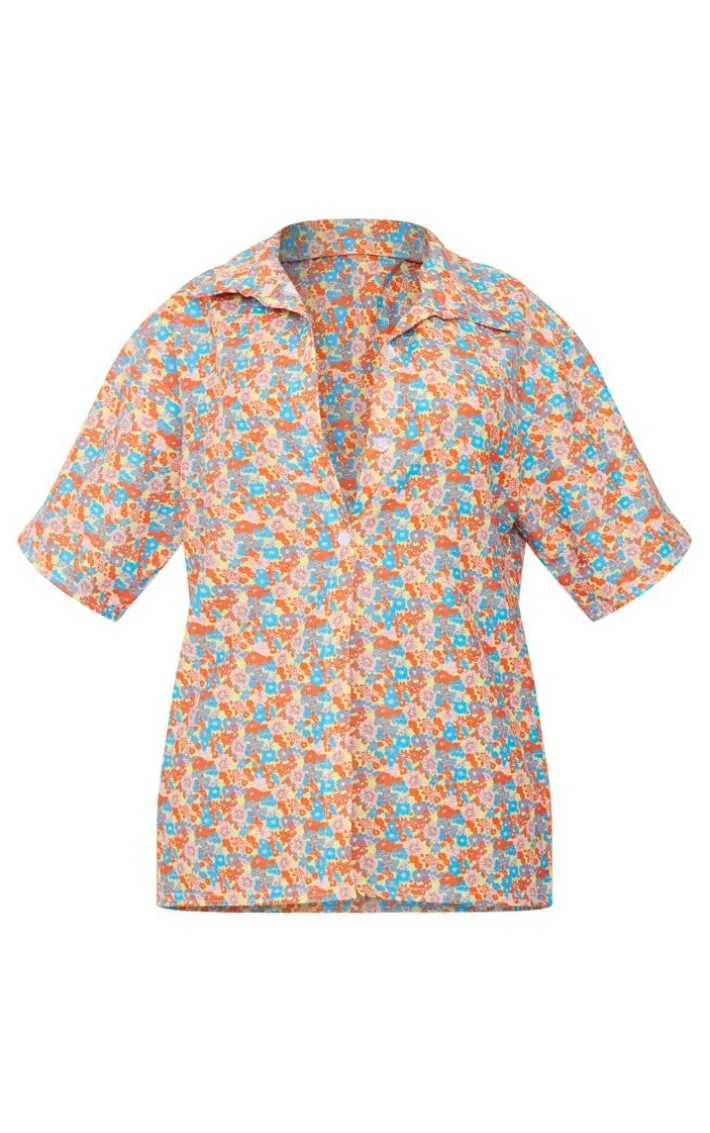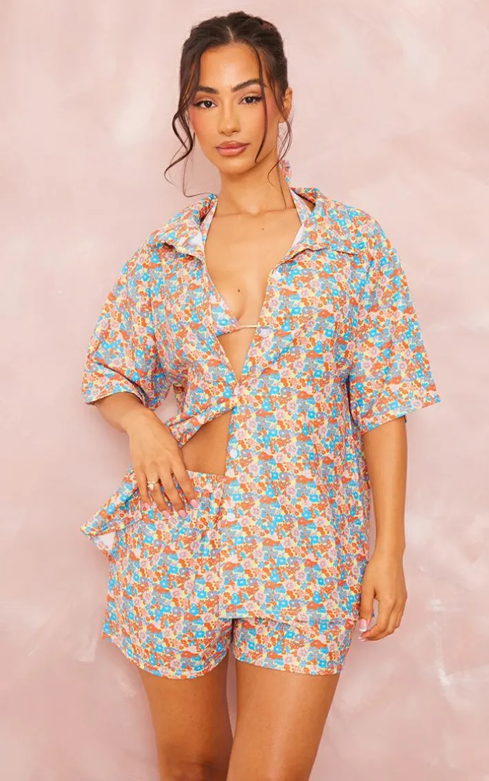 Get your vacay glam on point with this blue dit’sy floral print button up beach shirt. This shirt is brought to you in a blue dit’sy floral print material with a button-up front, we are seriously obsessed. With it’s statement hue you’re sure to have all eyes on you. To complete the look style with the matching shorts, sandals and accessories for a vacay look that is sure to be your new fave.