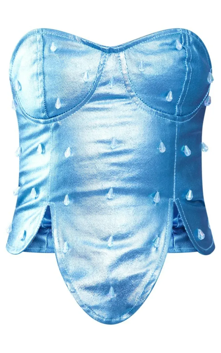 All eyes are sure to be on you with this must-have top. Featuring a metallic blue coated denim material with a corset design and a figure-flattering fit, we are in love. Simply pair with the matching bottoms and statement accessories to complete the look.