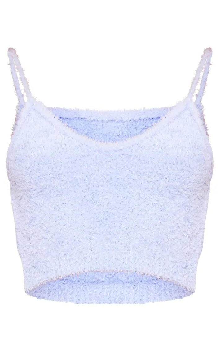 Bring all the cosy vibes to your outfit of the day with this blue fluffy soft knit crop bralet. Made from a dreamy blue hue fluffy soft knit material with a cropped fit, how can you say no? This blue bralet is sure to take everyday styling to new heights. We are loving this soft knit bralet styled with the matching shorts, gold hoops and chunky boots for an off-duty look like no other.