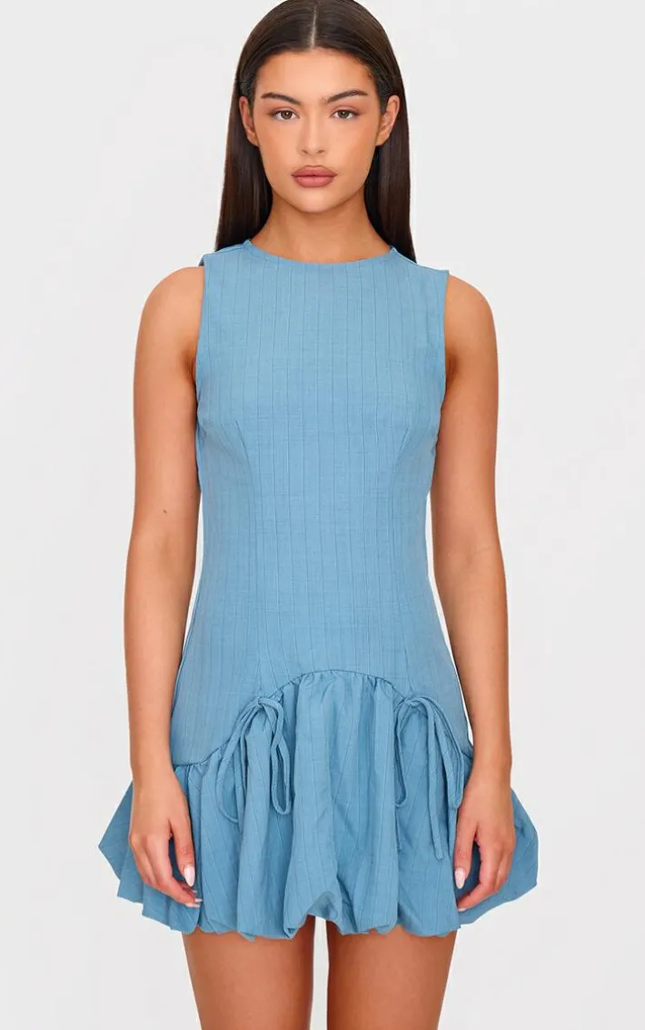 Enter the new season in style with this blue grey pinstripe racer puffball mini dress. Brought to you in a blue grey pinstripe material with a racer neckline, a puffball design and a mini fit, what more could you need? Team this mini dress with some knee high heeled boots and simple gold accessories for a look that is sure to earn you some serious style points.