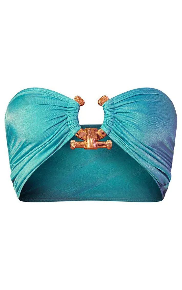 make sure all eyes are on you at the poolside in this bikini top. Featuring a blue material with a gold hammered detail and a flattering fit. Wear with the matching bottoms and your fave accessories to elevate the look.