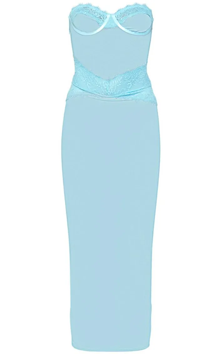 Take your weekend wardrobe to a whole new level with this blue lace bandeau underwired sheer midaxi dress. Its blue sheer material will make you stand out from the crowd and its lace details add a super chic touch to your look. This midaxi dress also features a bandeau neckline and underwired design which elevates your look to a whole new level. Style this midaxi dress with clear heels and all your fave accessories for a dreamy finish that is sure to impress.
