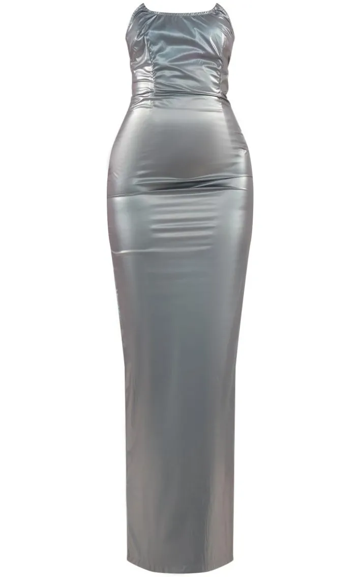 Have all eyes on you with this blue metallic acetate pointed hem maxi dress. This maxi dress is brought to you in a blue metallic acetate material with a pointed hem and a maxi length, what’s not to love? This maxi dress with it’s floor-sweeping length will have all eyes on you. Complete the look and style this with clear high heels and a faux fur jacket for a look like no other.