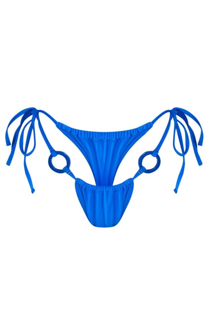 Go for all the fierce vibes on your next vacay with these blue o ring tie side bikini bottoms. These bikini bottoms feature a blue material with an O ring detail and a tie side design, you’ll be adding them straight to your suitcase. Pair with the matching top and gold accessories to elevate the look further.