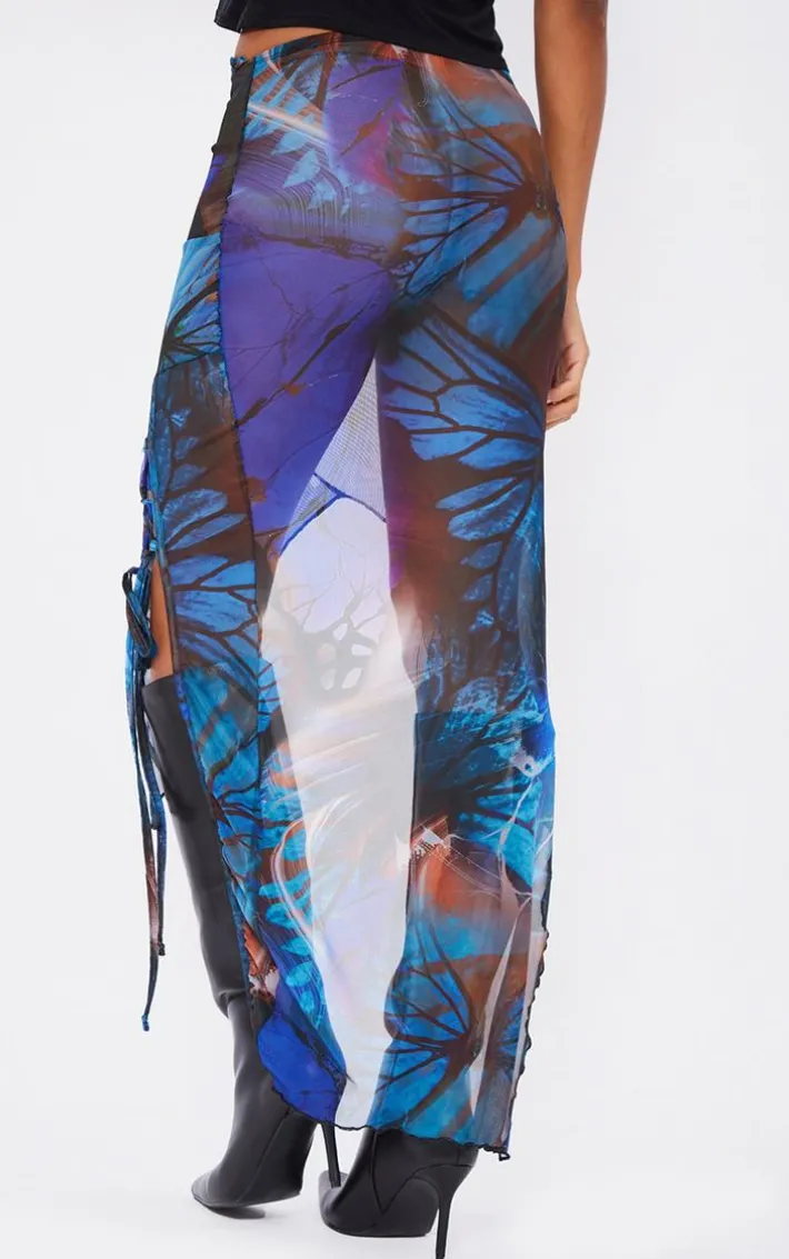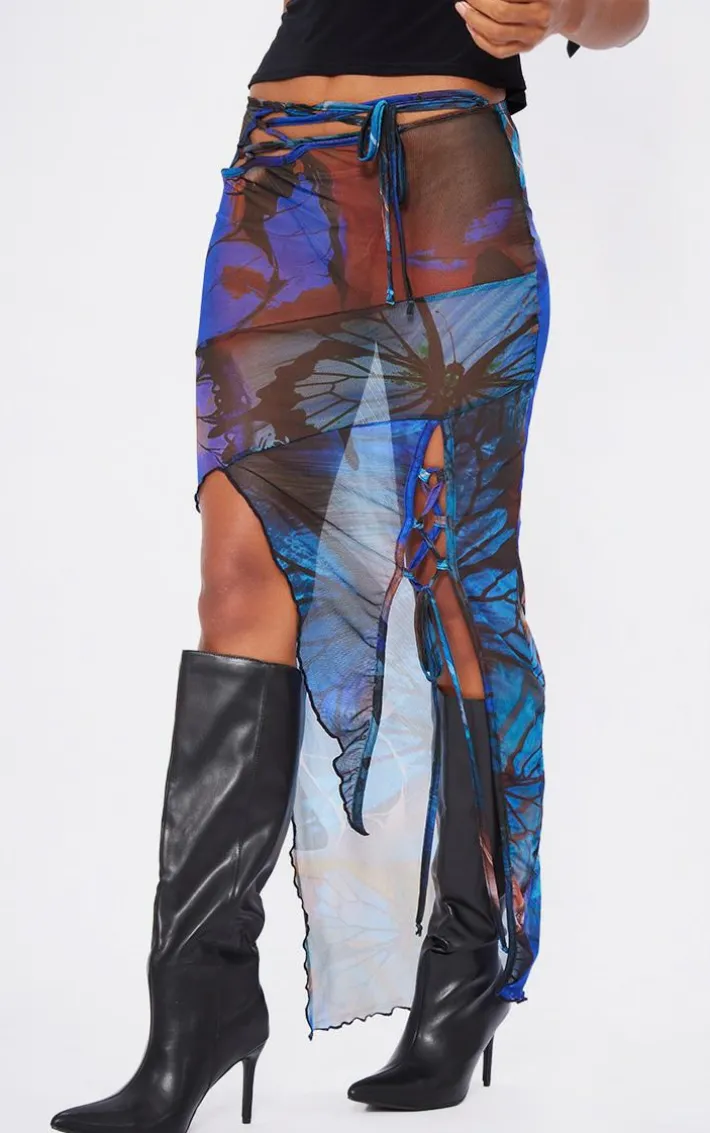 Bring all the mesh feels to your weekend look with this blue printed mesh asymmetric hem maxi skirt. Made from a blue hue mesh material with a statement print design, an asymmetric hem and a flattering maxi fit, how can you resist? Style this maxi skirt with a bandeau top, heels boots and gold accessories for a look that is sure to make you stand out from the crowd.