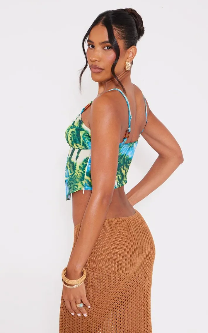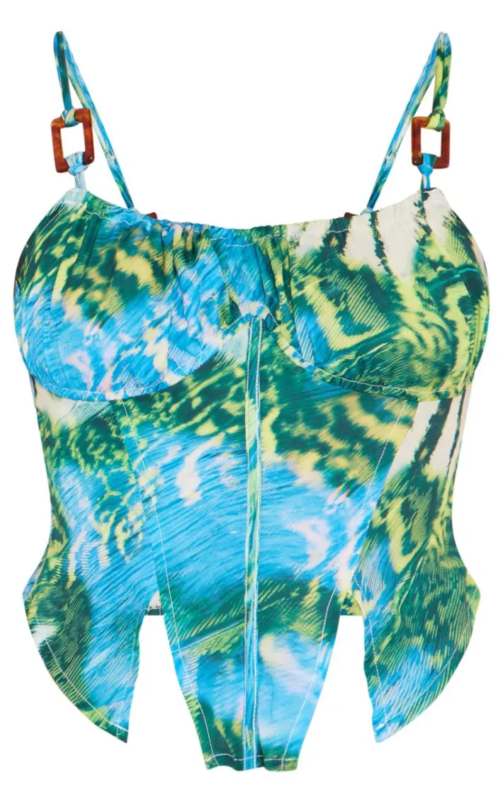 Bring all the attitude to your new season wardrobe with this blue printed textured satin tortoise shell detail corset, we’re in love. This corset features a blue printed satin material with a tortoise shell trim detail and a figure-worshipping fit. Style this satin corset with a maxi skirt, heels and statement gold accessories for a look everyone will remember.
