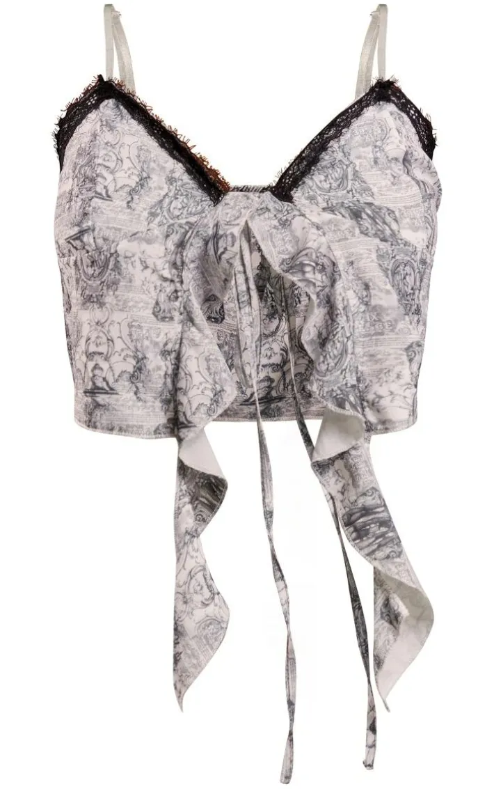 Take your weekend look that extra mile with this blue renaissance woven frill split lace trim front cami top. Brought to you in a blue hue woven material with a renaissance print, a split front design and lace trim detailing for that extra touch of luxe, we just can’t get enough. Style this cami top with a mini skirt, your fave heels and statement gold accessories for an effortlessly chic look to be remembered.