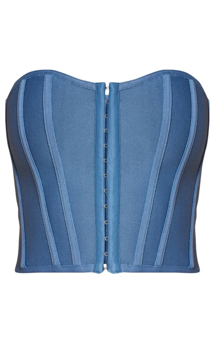 Show off your confident side with this unreal corset. Featuring a steel blue bandage material with hook and eye fastenings and a structured design. Wear with your fave bottoms and strappy heels to earn some serious style points.