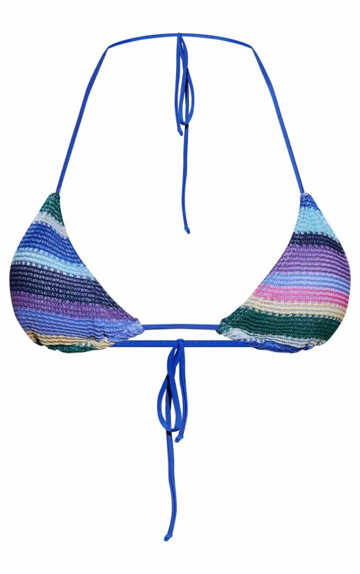 Create a vacay look no one will forget with this blue stripe textured triangle bikini top. This bikini top is brought to you in a blue stripe texture material with triangle cups, how could you turn this down? This bikini top is everything and more we’re loving paired with the matching bikini bottoms, sandals and accessories for a vacay combo everyone will remember.